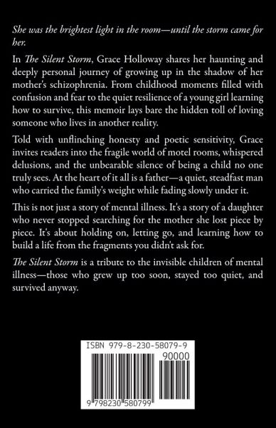 She was the brightest light in the room-until the storm came for her. In The Silent Storm, Grace Holloway shares her haunting and deeply personal journey of growing up in the shadow of her mother's schizophrenia. From childhood moments filled with confusion and fear to the quiet resilience of a young girl learning how to survive, this memoir lays bare the hidden toll of loving someone who lives in another reality. Told with unflinching honesty and poetic sensitivity, Grace invites readers into the fragile world of motel rooms, whispered delusions, and the unbearable silence of being a child no one truly sees. At the heart of it all is a father-a quiet, steadfast man who carried the family's weight while fading slowly under it. This is not just a story of mental illness. It's a story of a daughter who never stopped searching for the mother she lost piece by piece. It's about holding on, letting go, and learning how to build a life from the fragments you didn't ask for. The Silent Storm is a tribute to the invisible children of mental illness-those who grew up too soon, stayed too quiet, and survived anyway.