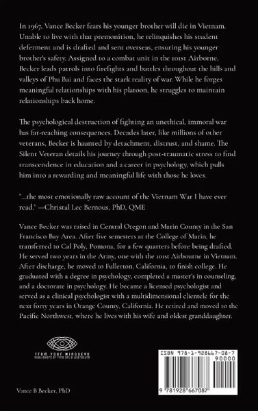 In 1967, Vance Becker fears his younger brother will die in Vietnam. Unable to live with that premonition, he relinquishes his student deferment and is drafted and sent overseas, ensuring his younger brother's safety. Assigned to a combat unit in the 101st Airborne, Becker leads patrols into firefights and battles throughout the hills and valleys of Phu Bai and faces the stark reality of war. While he forges meaningful relationships with his platoon, he struggles to maintain relationships back home. The psychological destruction of fighting an unethical, immoral war has far-reaching consequences. Decades later, like millions of other veterans, Becker is haunted by detachment, distrust, and shame. The Silent Veteran details his journey through post-traumatic stress to find transcendence in education and a career in psychology, which pulls him into a rewarding and meaningful life with those he loves.