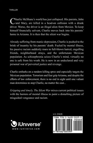 Charlie McShane's world has just collapsed. His parents, John and Mary, are killed in a head-on collision with a drunk driver. Worse, the driver is an illegal alien from Mexico. To keep himself from destitution, Charlie moves back into his parents' home in Arizona. And it is then that the silent war begins. Already suffering from mental illness, Charlie is pushed to the brink his parents' death. His passive racism suddenly roars to full-blown hatred, engulfing friends, neighborhood strays, and the unfortunate Mexican population. As schizophrenia seizes Charlie's mind, virtually no one is safe from Charlie's wrath. He is now in an undeclared and very personal war of perverted justice and revenge. Charlie embarks on a random killing spree and especially targets the Mexican population. Fear and terrorism grip Arizona, and despite the efforts of law enforcement, there is no end in sight until one valiant man determines to stop Charlie, no matter the cost ... Gripping and timely, The Silent War mixes current political issues with the horrors of mental illness to paint a disturbing picture of misguided vengeance and racism.
