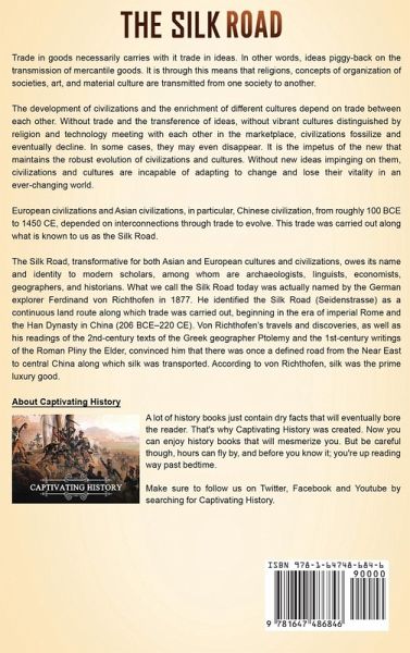 If you want to discover the captivating history of the Silk Road, then keep reading... The Silk Road, which has been understood as a generalized route of trade between the East and the West, is different from European, North African, and Near Eastern trade routes because until recently, it has been understood as solely being a land route; in fact, it was believed to be the longest overland trade route in human history. The history of the Silk Road is extremely complex. It cannot be told as a singular chronological narrative. Different cultures and societies rose and vanished along the Silk Road, and peoples migrated from one region to another. In short, for most of its history, there was fluidity as to the dominant cultures along the route or routes. Explaining the rise and fall or disappearance of these cultures involves stopping along the way to consider the chronology of their histories. In The Silk Road: A Captivating Guide to the Ancient Network of Trade Routes Established during the Han Dynasty of China and How It Connected the East and West, you will discover topics such as Rome, Silk, and Ancient Geography Han Silk Production and Trade The Kingdom of Loulan Buddhists along the Silk Road Turfan: An Oasis on the Silk Road The Legend of Prester John Genghis Khan, Ruler of the Whole World The Lord of Xanadu, Kublai Khan: The Emperor of China Marco Polo Visits Kublai Khan's China The Final Years of Kublai Khan And much, much more! So if you want to learn more about the Silk Road scroll up and click the "add to cart" button!