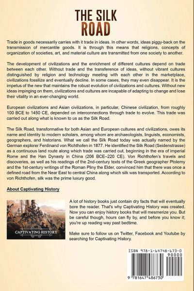 If you want to discover the captivating history of the Silk Road, then keep reading... The Silk Road, which has been understood as a generalized route of trade between the East and the West, is different from European, North African, and Near Eastern trade routes because until recently, it has been understood as solely being a land route; in fact, it was believed to be the longest overland trade route in human history. The history of the Silk Road is extremely complex. It cannot be told as a singular chronological narrative. Different cultures and societies rose and vanished along the Silk Road, and peoples migrated from one region to another. In short, for most of its history, there was fluidity as to the dominant cultures along the route or routes. Explaining the rise and fall or disappearance of these cultures involves stopping along the way to consider the chronology of their histories. In The Silk Road: A Captivating Guide to the Ancient Network of Trade Routes Established during the Han Dynasty of China and How It Connected the East and West, you will discover topics such as Rome, Silk, and Ancient Geography Han Silk Production and Trade The Kingdom of Loulan Buddhists along the Silk Road Turfan: An Oasis on the Silk Road The Legend of Prester John Genghis Khan, Ruler of the Whole World The Lord of Xanadu, Kublai Khan: The Emperor of China Marco Polo Visits Kublai Khan’s China The Final Years of Kublai Khan And much, much more! So if you want to learn more about the Silk Road scroll up and click the "add to cart" button!