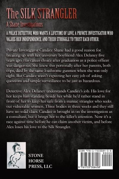 A police detective who wants a lifetime of love, a private investigator who values her independence, and their struggle to trust each other.Private Investigator Candice Shane had a good reason for breaking up with her university boyfriend Alex Delaney five years ago. His career choice after graduation as a police officer was dangerous. She knew this personally after her parents, both cops, died by the same loathsome gunmen when she was only eight. But Candice wasn't expecting her easy job of asking questions and simple surveillance to be just as hazardous. Detective Alex Delaney understands Candice's job. His love for her keeps him standing beside her while he'd rather stand in front of her to keep her safe from a maniac strangler who seeks out vulnerable women. Three bodies in three weeks and they still have no solid clues. Candice is brought in on the investigation as a consultant, but even being in the background brings her to the killer's attention. Now it's a race against time before he can claim another victim, and before Alex loses his love to the Silk Strangler. The Silk Strangler: A Shane Investigations is a gripping crime thriller filled with heart-melting romance and mystery.