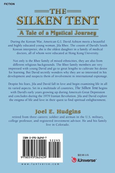 During the Korean War, American G.I. David Ashton meets a beautiful and highly educated young woman, Jila Rhee. The cousin of David's South Korean interpreter, she is the oldest daughter in a family of medical doctors, all of whom were educated at Hong Kong University. Not only is the Rhee family of mixed ethnicities, they are also from different religious backgrounds. The Rhee family members are very impressed with young David and go to great lengths to cultivate his desire for learning. But David secretly wonders why they are so interested in his development and suspects them of involvement in international espionage. Despite his fears, Jila and David fall in love and begin examining life in all its varied aspects. Set in a multitude of countries, The Silken Tent begins with David's early years growing up during America's Great Depression and concludes during the 1979 Iranian Revolution. Jila and David explore the enigma of life and love in their quest to find spiritual enlightenment.