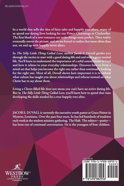 In a world that sells the idea of fairy tales and happily ever afters, many of us spend our dating lives looking for our Prince Charmings or Cinderellas. The first blush of a new romance can make things seem perfect. Then reality eventually enters the picture, and we are forced to realize that more often than not, we end up with happily never afters. In The Silly Little Thing Called Love, author Jacob S. Duvall guides you through the tactics to start with a good dating life and end with a great marital life. Yoüll learn to understand the importance of a solid commitment to God and how it relates to your everyday relationships. Discover how to form a mind-set that helps you become the right one rather than continually looking for the right one. Most of all, Duvall shows how important it is to rethink what culture has taught you about relationships and refocus instead on what Christ has to say about them. Living a Christ-filled life does not mean you can¿t have an active dating life. But in The Silly Little Thing Called Love, yoüll learn how to spend that time developing the skills needed for a true happily ever after.