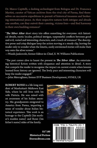 Dr. Marco Capitelli, a dashing archeologist from Bologna and Dr. Francesca Martini, curator of Vatican archives from the rival city of Parma, find themselves on successive expeditions in pursuit of historical treasures and brokering international peace. As their respective natures both intrigue and abrade one another, can they outwit their cunning, vicious foes-and find harmony in their own budding romance? "The Silver Altar short story trio offers something for everyone: rich historical details, exotic locales, political intrigue, suspenseful conflicts between good and evil, varied and interesting characters, and a touch of romance! The descriptive prose and crisp dialogue keep the action moving at a steady clip, leaving the reader only to wonder when the kinetic, easily envisioned stories will make their way onto the silver screen."-Wanda Jankowski, former Editor-in-Chief, E. W. Williams Publications "The past comes alive to haunt the present in The Silver Altar. An entertaining historical fiction written with eloquence and attention to detail. A story that compels the reader to recognize the impact on current events when lessons learned from history are ignored. The lively pace and interesting characters will keep the reader engaged."-John Mercogliano, former EVP Business Development, NYNEX, UK