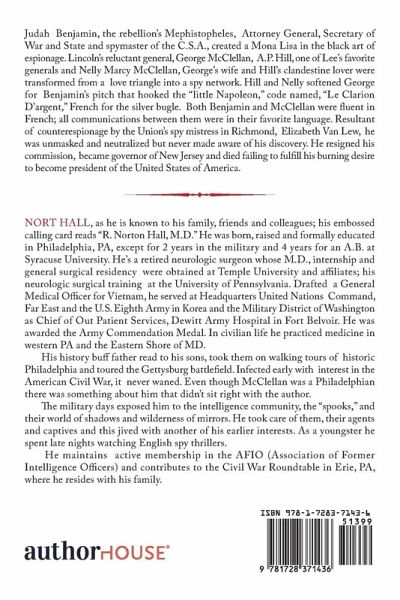 Judah Benjamin, the rebellion's Mephistopheles, Attorney General, Secretary of War and State and spymaster of the C.S.A., created a Mona Lisa in the black art of espionage. Lincoln's reluctant general, George McClellan, A.P. Hill, one of Lee's favorite generals and Nelly Marcy McClellan, George's wife and Hill's clandestine lover were transformed from a love triangle into a spy network. Hill and Nelly softened George for Benjamin's pitch that hooked the "little Napoleon," code named, "Le Clarion D'argent," French for the silver bugle. Both Benjamin and McClellan were fluent in French; all communications between them were in their favorite language. Resultant of counterespionage by the Union's spy mistress in Richmond, Elizabeth Van Lew, he was unmasked and neutralized but never made aware of his discovery. He resigned his commission, became governor of New Jersey and died failing to fulfill his burning desire to become president of the United States of America.