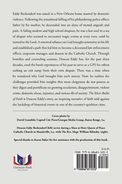 Eddy Beckendorf was raised in a New Orleans home marred by domestic violence. Following the sensational killing of his philandering police officer father by his mother, he descended into an abyss of mental anguish and pain. A failing student and high school dropout, he was a lost soul in a sea of despair who seemed to encounter tragic events at every turn, until he turned to the Lord. A renewed reliance on God brought symmetry to his life and established a path that led him to become a decorated law enforcement officer, corporate manager, and deacon in the Catholic Church. Through homilies and counseling sessions, Deacon Eddy has, for the past three decades, used the harsh experiences of his past to serve as a GPS for others seeking an exit ramp from their own despair. There was a time when he wondered why God brought him such misery. Now, he realizes the challenges provided him insights that most clergymen do not possess as they digest and pontificate on growing secularism, disappointment, violent crime, domestic abuse, injustice, and various ills of society. The Silver Bullet of Faith is Deacon Eddy's story, an inspiring narrative of faith told against the backdrop of historical events in one of the country's quirkiest cities.