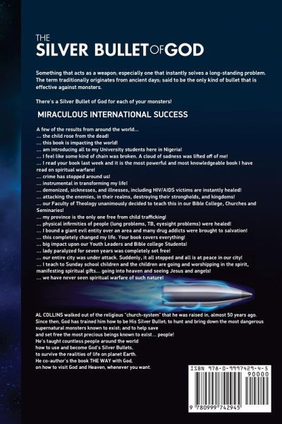 THE SILVER BULLET… … something that acts as a weapon; especially one that instantly solves a long-standing problem. The term traditionally originates from ancient days; said to be the only kind of bullet that is effective against monsters. There’s a Silver Bullet of God for each of your monsters! INTERNATIONAL SUCCESS! A few of the results from around the world... … the child rose from the dead! … impacting the world! … am introducing all to my University students here in Nigeria! … I feel like some kind of chain was broken. A cloud of sadness was lifted off of me! … I read your book last week and it is the most powerful and most knowledgeable book I have read on spiritual warfare! … crime has stopped around us! … instrumental in transforming my life! … demonized, sicknesses, and illnesses, including HIV/AIDS victims are instantly healed! … attacking the enemies, in their realms, destroying their strongholds, and kingdoms! … our Faculty of Theology unanimously decided to teach this in our Bible College, Churches and Seminaries! … my province is the only one free from child trafficking! … physical infirmities of people (lung problems, TB, eyesight problems) were healed! … I bound a giant evil entity over an area and many drug addicts were brought to salvation! … this completely changed my life. Your book covers everything! … big impact upon our Youth Leaders and Bible College Students! … lady paralyzed for seven years was completely set free! … our entire city was under attack. Suddenly, it all stopped and all is at peace in our city! … I teach to Sunday school children and the children are going and worshipping in the spirit, manifesting spiritual gifts... going into heaven and seeing Jesus and angels! … we have never seen spiritual warfare of such nature!
