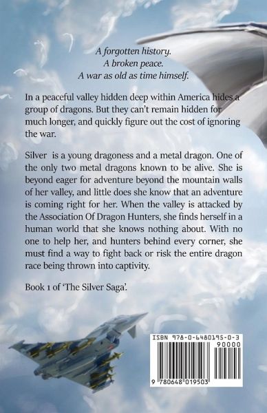 A Forgotten History A Broken Peace A War as Old as Time Himself In a peaceful valley hidden deep within America hides a group of dragons. But they can't remain hidden for much longer, and quickly figure out the cost of ignoring the war. Silver is a young dragoness and a metal dragon. One of the only two metal dragons known to be alive. She is beyond eager for adventure beyond the mountain walls of her valley, and little does she know that an adventure is coming right for her. When the valley is attacked by the Association of Dragon Hunters, she finds herself in a human world she knows nothing about. With no one to help her, and hunters behind every corner, she must find a way to fight back or risk the entire dragon race being thrown into captivity. Book 1 of 'The Silver Saga'
