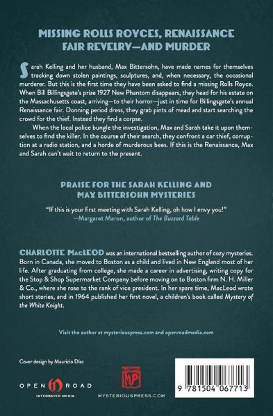 Missing Rolls Royces, Renaissance fair revelry--and murder: "A witty, literate and charming mystery" featuring Boston's married art sleuths ( Publishers Weekly). Sarah Kelling and her husband, Max Bittersohn, have made names for themselves tracking down stolen paintings, sculptures, and, when necessary, the occasional murderer. But this is the first time they have been asked to find a missing Rolls Royce. When Bill Billingsgate's prize 1927 New Phantom disappears, they head for his estate on the Massachusetts coast, arriving--to their horror--just in time for Billingsgate's annual Renaissance fair. Donning period dress, they grab pints of mead and start searching the crowd for the thief. Instead they find a corpse. When the local police bungle the investigation, Max and Sarah take it upon themselves to find the killer. In the course of their search, they confront a car thief, corruption at a radio station, and a horde of murderous bees. If this is the Renaissance, Max and Sarah can't wait to return to the present.