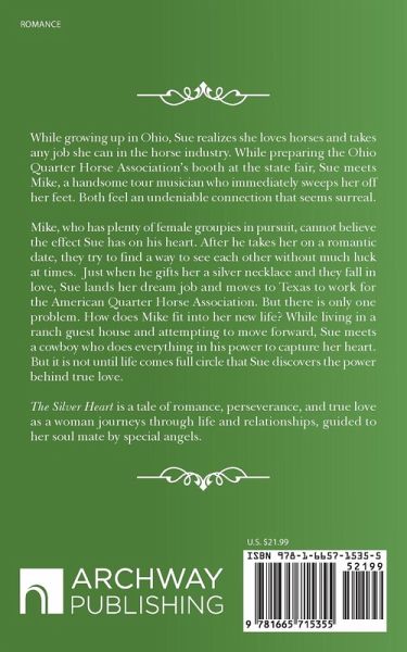 A young girl from Ohio grew up loving horses and took any job she could in the horse industry. One afternoon while working at the Ohio State Fair, she meets a handsome singer who sweeps her off her feet. He takes her on a romantic date and gives her a silver heart necklace. Sue falls in love but then she gets the job of a lifetime and moves from Ohio to work for the American Quarter Horse Association in Texas. Will Mike move with her, or will this create a divide between them? She lives in a ranch guest house and pays for her room and board by doing marketing for the owners. While working there she meets a cowboy who does everything he can to get her attention. What part will he play in this love story? Looking back on her life, Sue realizes how much she was loved and takes you on her journey, eventually becoming the largest breeder of Quarter Horses in the United States. Her life is filled with adventure, love and sadness.