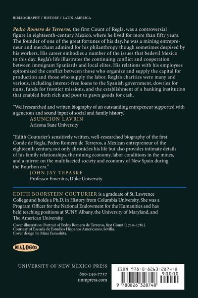 Pedro Romero de Terreros, the first Count of Regla, was born in Spain in 1710. When he was twenty-one, his parents sent him to live with an uncle in New Spain and to assume control of the family's businesses. He married the daughter of a wealthy noble family in Mexico City and continued to build on the combined fortunes as a merchant and a mining entrepreneur. From the mid-eighteenth century until his death in 1781, Regla was admired for his philanthropy, the recipients of which included colleges and monasteries and he helped establish a banking institution that enabled both rich and poor to pawn goods for cash. Regla's life also illustrates many of the problems facing Mexico today including struggles in the workplace between those who supply the capital for production and those who supply the labor. Edith Boorstein Couturier uses Regla's career to address the growing social tensions of the eighteenth century, showing how Spanish immigrants could ascend in Mexican society, how entrepreneurship permitted such social climbing, how women sustained their kinsmen, and how elite families rose and fell in New Spain.