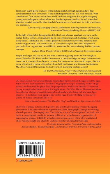 "People live longer and stay active. But what is marketing doing about it? Not enough, it seems. Therefore The Silver Market Phenomenon is timely and right on target. It is no coincidence that it emanates from Japan, a country that treats senior citizens with respect. But the scope of the book is global with authors from both the Eastern and Western hemispheres. My advice: Consult this seminal book at your next marketing strategy session!" -- Dr. Evert Gummesson, Professor of Marketing and Management, Stockholm University School of Business, Sweden