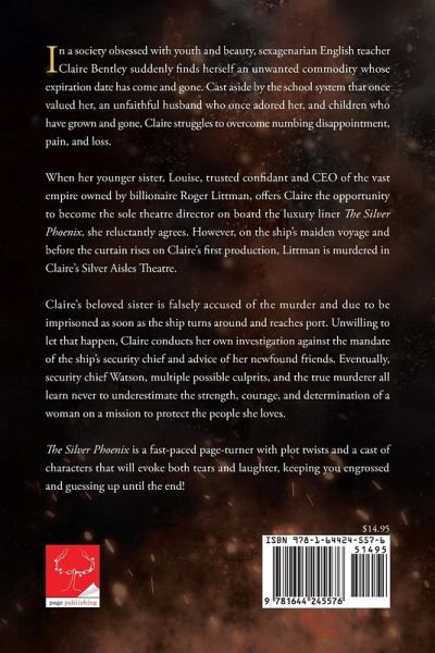 In a society obsessed with youth and beauty, sexagenarian English teacher Claire Bentley suddenly finds herself an unwanted commodity whose expiration date has come and gone. Cast aside by the school system that once valued her, an unfaithful husband who once adored her, and children who have grown and gone, Claire struggles to overcome numbing disappointment, pain, and loss. When her younger sister, Louise, trusted confidant and CEO of the vast empire owned by billionaire Roger Littman, offers Claire the opportunity to become the sole theatre director on board the luxury liner The Silver Phoenix, she reluctantly agrees. However, on the ship's maiden voyage and before the curtain rises on Claire's first production, Littman is murdered in Claire's Silver Aisles Theatre. Claire's beloved sister is falsely accused of the murder and due to be imprisoned as soon as the ship turns around and reaches port. Unwilling to let that happen, Claire conducts her own investigation against the mandate of the ship's security chief and advice of her newfound friends. Eventually, security chief Watson, multiple possible culprits, and the true murderer all learn never to underestimate the strength, courage, and determination of a woman on a mission to protect the people she loves. The Silver Phoenix is a fast-paced page-turner with plot twists and a cast of characters that will evoke both tears and laughter, keeping you engrossed and guessing up until the end!