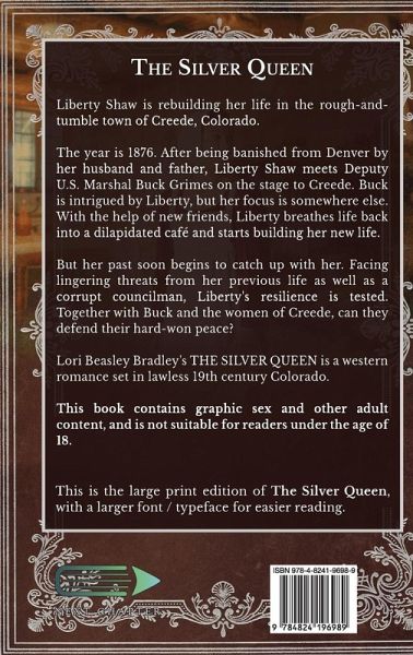 Liberty Shaw is rebuilding her life in the rough-and-tumble town of Creede, Colorado. The year is 1876. After being banished from Denver by her husband and father, Liberty Shaw meets Deputy U.S. Marshal Buck Grimes on the stage to Creede. Buck is intrigued by Liberty, but her focus is somewhere else. With the help of new friends, Liberty breathes life back into a dilapidated café and starts building her new life. But her past soon begins to catch up with her. Facing lingering threats from her previous life as well as a corrupt councilman, Liberty's resilience is tested. Together with Buck and the women of Creede, can they defend their hard-won peace? Lori Beasley Bradley's THE SILVER QUEEN is a western romance set in lawless 19th century Colorado. This book contains graphic sex and other adult content, and is not suitable for readers under the age of 18. This is the large print edition of The Silver Queen, with a larger font / typeface for easier reading.
