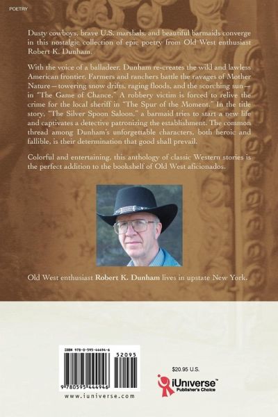 Dusty cowboys, brave U.S. marshals, and beautiful barmaids converge in this nostalgic collection of epic poetry from Old West enthusiast Robert K. Dunham. With the voice of a balladeer, Dunham re-creates the wild and lawless American frontier. Farmers and ranchers battle the ravages of Mother Nature-towering snow drifts, raging floods, and the scorching sun-in "The Game of Chance." A robbery victim is forced to relive the crime for the local sheriff in "The Spur of the Moment." In the title story, "The Silver Spoon Saloon," a barmaid tries to start a new life and captivates a detective patronizing the establishment. The common thread among Dunham's unforgettable characters, both heroic and fallible, is their determination that good shall prevail. Colorful and entertaining, this anthology of classic Western stories is the perfect addition to the bookshelf of Old West aficionados.