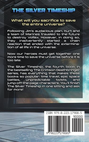 What will you sacrifice to save the entire universe? Following Jim's audacious plan, Kurt and a team of Marines traveled to the future to destroy Voltex. However, in doing so, they inadvertently started a chain reaction that ended with the extermination of all life in the universe. Now our heroes must get together one more time to save the universe before it is too late. The Silver Timeship, the fourth book in the bestselling The Crimson Deathbringer series, has everything that makes these books so popular: time travel, epic space battles, unpredictable twists, and jump-off-the-page characters. You'll finish The Silver Timeship in one sitting and ask for more! Pick up Jim's latest adventure today!