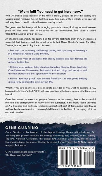 "Mom fell! You need to get here now." With 77 million baby boomers in the United States, people all over the country are worried about receiving the call that their mom, their dad, or their elderly loved one will suddenly have a health crisis with no one nearby to help. This generation that is responsible for aging parents is actively looking for a solution-a place for their loved ones to be cared for by professionals. That place is called "Residential Assisted Living," or RAL. An enormous opportunity has opened up for anyone looking to start, own, or operate a successful RAL business, and the good news is that Gene Guarino's book, The Silver Tsunami, is your practical guide to discover: * Pros and cons to owning and leasing, owning and operating, or investing in in a Residential Assisted Living business, * The specific types of properties that elderly clientele and their families are actively looking for, * Categories of assisted living situations (including Memory Care, Continuing Care Retirement Communities, Residential Assisted Living, and more), as well as which provides the best opportunity for new investors, * How to "recession-proof" your business from Day 1, so that you're building a long-term, appreciable asset in your RAL. Whether you are an investor, a real estate provider or you want to operate a RAL business itself, Gene's BLUEPRINT will save you time, effort, and money with this proven formula. Gene has trained thousands of people from across the country, how to be successful investors and entrepreneurs in many different businesses. In this book, Gene provides an A-Z blueprint and pathway to become a significant part of this lucrative industry, as well as the chance to make a meaningful difference in the lives of our aging relatives and their families.