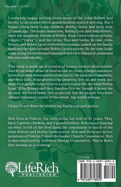 I seriously began writing down many of the John Robert and Bobby Lyon stories when grandchildren started arriving. But I began telling them to my children, Bobby, Greer, and Andy over 25 years ago. The main characters, Bobby Lyon and John Robert, were the imaginary friends of Bobby. Soon Greer told me of Sally, Cappie ("Cathy"), and the twins, Tina and Sasha. In time, John Robert and Bobby Lyon evolved into cousins, raised on the family farm and the girls became Bobby Lyon's sisters. By the time Andy came along the stories had seasoned and each character possessed his own individuality. This book is made up of a series of loosely-related short stories, which can stand alone or read as one to create a larger narrative. Grownups pass down stories of the family, the land, the community, and their faith. Four generations presently live on and work this land. Few people today believe a place exists like the farm Bobby Lyon, John Robert and their families live on; though it is not the ground, the terra firma, that is special, but the people who have chosen this small corner of the whole, big world as home I hope I have done the stories my family enjoyed justice.