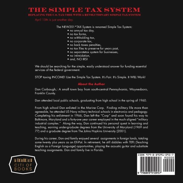 Daniel V. Carbaugh, BA, MS was born in south-central Pennsylvania in 1942. He graduated from high school in 1960, did a hitch in the U.S. Marine Corps and then, too soon, found himself back in his hometown in 1965 looking for a job. Thanks to skills recently acquired from his military service (and a little luck) Dan soon found his way to a forty-two year career with Westinghouse Electronic System in Baltimore. Along the way Dan earned an undergraduate degree from University of Maryland and a graduate degree in Engineering Management from the Johns Hopkins University. Dan and his family endured twenty plus years as expatriates in Europe, South-east Asia, South America, and North Africa. He retired from engineering management in 2007 and moved with his wife to south-west Florida. Dan's interest in tax reform came as a result of caring about fixing the federal tax code so that he could finally understand it.