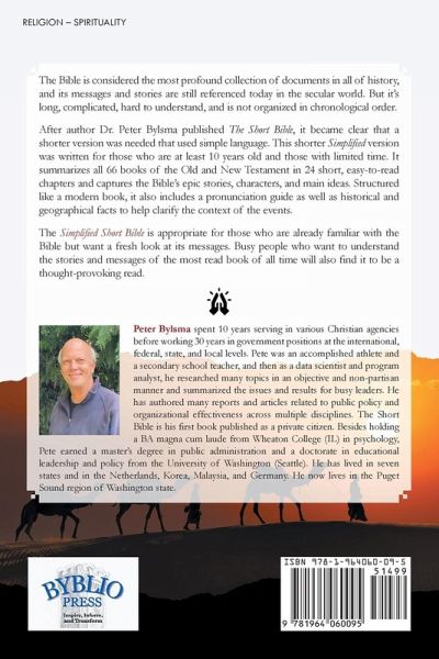 The Bible is considered the most profound collection of documents in all of history, and its messages and stories are still referenced today in the secular world. But it's long, complicated, hard to understand, and is not organized in chronological order. After author Dr. Peter Bylsma published The Short Bible, it became clear that a shorter version was needed that used simple language. This shorter Simplified version was written for those who are at least 10 years old and those with limited time. It summarizes all 66 books of the Old and New Testament in 24 short, easy-to-read chapters and captures the Bible's epic stories, characters, and main ideas. Structured like a modern book, it also includes a pronunciation guide as well as historical and geographical facts to help clarify the context of the events. The Simplified Short Bible is appropriate for those who are already familiar with the Bible but want a fresh look at its messages. Busy people who want to understand the stories and messages of the most read book of all time will also find it to be a thought-provoking read.