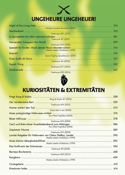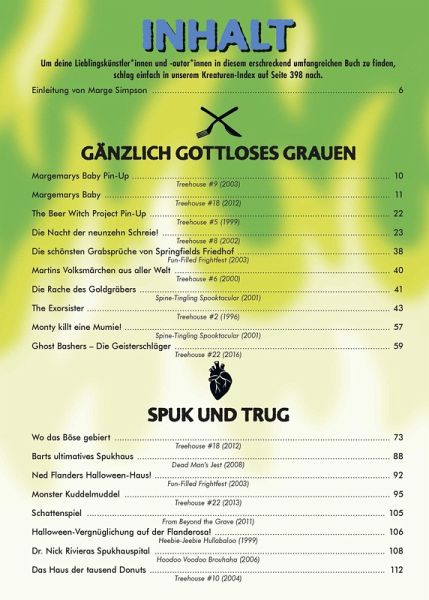 Im »Treehouse of Horror« begann 1995 die unheimliche Verbindung des gruseligsten aller Feste und der berühmtesten aller TV-Familien unheimlich komisch und unheimlich starbesetzt! 23 Spezialausgaben der »The Simpsons«-Comics sind seitdem erschienen und bringen das Who s Who von Springfield mit den kultigsten Klassikern aus Horror, SciFi und Fantasy zusammen. Darüber hinaus haben sich im Laufe der Zeit zahlreiche herausragenden Comic-Schaffende im »Treehouse of Horror« verewigt.