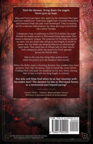 The Diabolus Chronicles' penultimate book. Find the daemon. Bring down the angels. Never give up hope. Silas and Pitch have been torn apart by the nefarious Morrigan and their maleficium. Traiterous angels have revealed themselves, and monsters from the past have reemerged. Time is running out for a daemon held prisoner by those plotting to overthrow the Lord of Arcadia. A desperate hunt is underway to find Pitch before the angel behind the deadly attack in Sherwood Forest does more than loosen a daemonic tongue. The existence of the halo is a secret no more. Nor are those who will go to any length to wield its power. But the Order are keeping Silas on an infuriatingly tight leash. They want him to remain safe in their secure York compound, while the search for Pitch spreads across the British Isles. Safe is the very last thing Silas wishes to be, while his prince is in the hands of their enemy. Silas promised Pitch he would never abandon him, never turn his back on all that it meant to love Tobias Astaroth. Every moment that passes feels like a betrayal of that promise. When the Order make a shocking decision that renders him more prisoner than Pale Horseman, Silas is tested like never before. Finding Pitch will push the deadman to his very limits, forcing him to face a truth he's long fought to conceal. And who will Silas find when he at last reunites with his stolen love? The daemon he lost in Sherwood Forest, or a tormented soul beyond saving? Content Advice - Violence, blood and gore, torture. Reference to prevous incident of sexual assault.