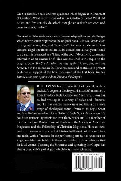 An amicus brief or amicus curiae is a legal document submitted by someone not directly connected to a case. It is presented as a "friend of the court" or amicus curiae, commonly referred to as an amicus brief. The Amicus Brief answers a number of questions and challenges which have risen in response to the original book "The Sin Paradox; the case against Adam, Eve, and the Serpent" The Amicus Brief addresses and clarifies the points and aspects of the original case as well as introduce new evidence. It will also address alternate theories which have been presented elsewhere. Detailing where they fall short on a number of Biblical and scientific levels.