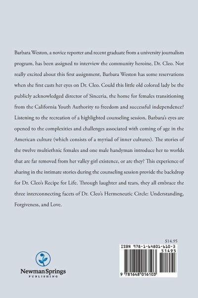 Barbara Weston, a novice reporter and recent graduate from a university journalism program, has been assigned to interview the community heroine, Dr. Cleo. Not really excited about this first assignment, Barbara Weston has some reservations when she first casts her eyes on Dr. Cleo. Could this little old colored lady be the publicly acknowledged director of Sinceria, the home for females transitioning from the California Youth Authority to freedom and successful independence? Listening to the recreation of a highlighted counseling session, Barbara's eyes are opened to the complexities and challenges associated with coming of age in the American culture (which consists of a myriad of inner cultures). The stories of the twelve multiethnic females and one male handyman introduce her to worlds that are far removed from her valley girl existence, or are they? This experience of sharing in the intimate stories during the counseling session provide the backdrop for Dr. Cleo's Recipe for Life. Through laughter and tears, they all embrace the three interconnecting facets of Dr. Cleo's Hermeneutic Circle: Understanding, forgiveness, and love.