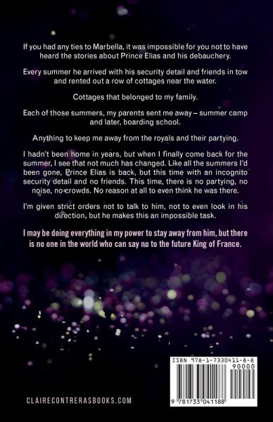 From New York Times Bestselling Author, Claire Contreras, comes a new, sexy, 100% stand-alone novel . . . 5 years ago, I attended a mascarade party and lost my virginity to the man who would one day become king... If you had any ties to Marbella, it was impossible for you not to have heard the stories about Prince Elias and his debauchery. Every summer he arrived with his security detail and friends in tow and rented out a row of cottages near the water. Cottages that belonged to my family. Each of those summers, my parents sent me away - to summer camp and later, boarding school. Anything to keep me away from the royals and their partying. I hadn't been home in years, but when I finally come back for the summer, I see that not much has changed. Like all the summers I'd been gone, Prince Elias is back, but this time with an incognito security detail and no friends. This time, there is no partying, no noise, and no crowds. No reason at all to even think he was there. I'm given strict orders not to talk to him, not to even look in his direction, but he makes this an impossible task. I may be doing everything in my power to stay away from him, but there is no one in the world who can say no to the future King of France.