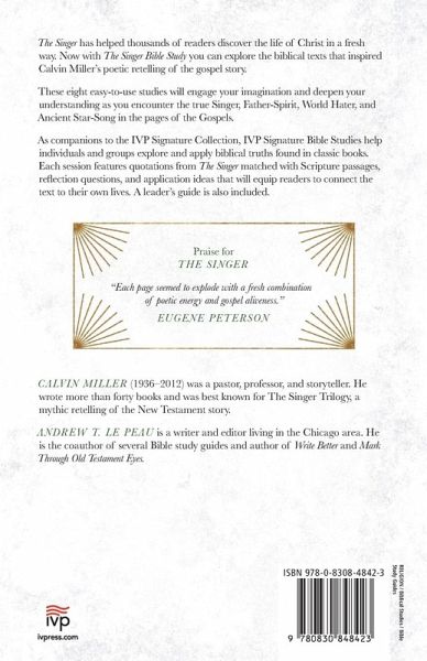 The Singer has helped thousands of readers discover the life of Christ in a fresh way. Now with The Singer Bible Study you can explore the biblical texts that inspired Calvin Miller's poetic retelling of the gospel story. These eight easy-to-use studies will engage your imagination and deepen your understanding as you encounter the true Singer, Father-Spirit, World Hater, and Ancient Star-Song in the pages of the Gospels. As companions to the IVP Signature Collection, IVP Signature Bible Studies help individuals and groups explore and apply biblical truths found in classic books. Each session features quotations from The Singer matched with Scripture passages, reflection questions, and application ideas that will equip readers to connect the text to their own lives. A leader's guide is also included.