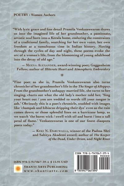 This collection of just over sixty poems tells the story of the author's paternal grandmother, Sitala, who lived in Kerala, South India, in the early to middle twentieth century. A composer of songs, Sitala was known to use her art to negotiate her position as a woman, wife, and colonial subject. Though the author, Pramila Venkateswaran, knows little about the details of her grandmother's life and none of her songs were preserved, Venkateswaran interviewed older living relatives in Alleppey, Kerala, and listened to folk music that would have influenced her grandmother's songs in order to chronicle Sitala's life and art. As Meena Alexander observes, "Moving through the cycles of day and night, these poems evoke the arc of a woman’s life, from the blossoming of young adulthood into the decay of old age." Venkateswaran creatively uses the rhythms of local musical forms such as kummi, kudiattam, naatu paadal (folk song) and vanchipaatu (boat song) to tell the stories about a woman living and growing old in India in the last century.