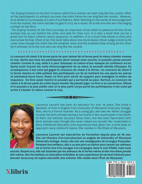 This book is about which farm animal can best sing like the rooster. After all the participants try out without success, the chick thinks he can sing like the rooster, but he is afraid to try because of a lack of confidence. After listening to the words of encouragement from his mother, the chick decides to give it a try. As a result, he is the one who wins the singing contest at the farm. The Singing Contest at the Farm is a book about farm animals and also is a book that can teach children to be patient by learning to wait for their turn, to understand sequences by using first, next, and then; and to boost their self-esteem by believing in themselves. Most of all, this book teaches one moral lesson: never judge a book by its cover. Ce livre parle de quel animal de la ferme peut le mieux chanter comme le coq. Après que tous les participants aient essayé sans succès, le poussin pense pouvoir chanter comme le coq, mais il a peur d'essayer en raison d'un manque de confiance en soi. Après avoir écouté les mots d'encouragement de sa mère, le poussin décide d'essayer. En conséquence, il est celui qui gagne le concours de chant à la ferme. Le concours de chant à la ferme est un livre sur les animaux de la ferme et aussi un livre qui peut apprendre aux enfants à faire preuve de patience en apprenant à attendre leur tour, à comprendre les séquences en utilisant d'abord, ensuite, puis, après, augmenter l'estime de soi en croyant en eux-mêmes. Surtout, ce livre donne une leçon morale: Ne jamais juger un livre à sa couverture.