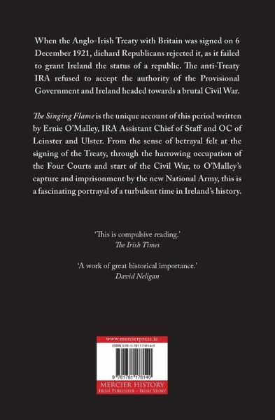 The Singing Flame is Ernie O'Malley's gripping firsthand account of his experiences fighting against the Anglo-Irish Treaty and the newly formed Irish Free State during the bitter Irish Civil War. As a diehard Republican who had reported directly to Michael Collins during the War of Independence, O'Malley refused to accept the Treaty's partition of Ireland. He served as a high-ranking IRA commander, leading the Republican forces in the pivotal Four Courts battle and later in Ulster and Leinster. Eventually captured and imprisoned until 1924, O'Malley was one of the last Republican prisoners released after the Free State's victory. Feeling exiled from the new Ireland, he penned these memoirs while living in the USA, providing invaluable insights into the divided Republican movement and the tragic Civil War that followed independence. First published in 1936 as a companion to his acclaimed War of Independence memoir On Another Man's Wound, The Singing Flame stands as a essential historical record from a key protagonists in Ireland's revolutionary period.