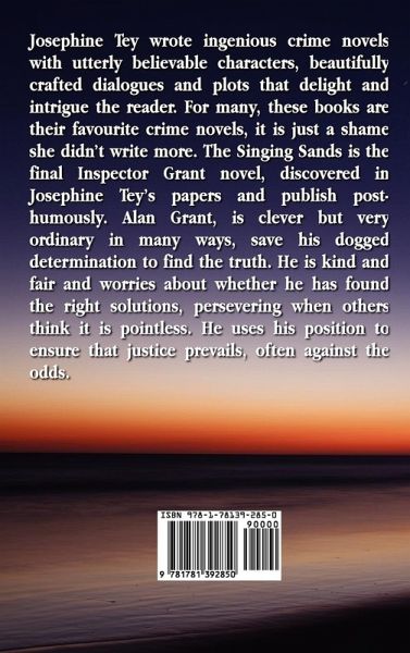 Josephine Tey wrote ingenious crime novels with utterly believable characters, beautifully crafted dialogues and plots that delight and intrigue the reader. For many, these books are their favourite crime novels, it is just a shame she didn't write more. The Singing Sands is the final Inspector Grant novel, discovered in Josephine Tey's papers and publish post-humously. Alan Grant, is clever but very ordinary in many ways, save his dogged determination to find the truth. He is kind and fair and worries about whether he has found the right solutions, persevering when others think it is pointless. He uses his position to ensure that justice prevails, often against the odds.