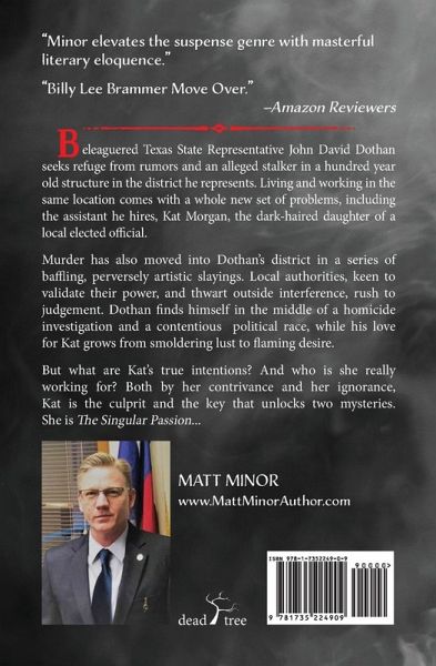 A pomegranate and rose, a feather, an ashen bird, an eight-pointed star... what do these and other 'symbols' have in common? And what do they mean, if anything? Back from a tumultuous legislative session, divorced from his pregnant wife Tryphena, and living the life of a vagabond, Texas State Representative John David Dothan returns to House District 100 a beleaguered man. But his problems are just beginning. Rumors abound of potential opponents, from both parties. And the local headlines warn of an alleged stalker. What he needs at present is lodging, for both his office...and himself. At the advice of his chief of staff, Mason Dixon, he takes up residence in a hundred year old structure at the heart of the district. But working and living in the same spot might prove to be a grave misstep. In desperate need of an assistant, Dothan hires Kat Morgan, the dark haired daughter of a local elected official. Working alone together, it's only a matter of time before an unprofessional love affair ensues. Soon the area is subsumed in a series of baffling, perversely artistic murders. Local authorities, under pressure to validate their power, circle the wagons for fear of outside interference. Suspect or solution, Dothan is dragged into both the investigation and a contentious political race; as his love for Kat consumes him. But what are Kat's true intentions? And who is she really working for? Both by her contrivance and her ignorance, Kat is the culprit and the key that unlocks two mysteries. She is The Singular Passion.