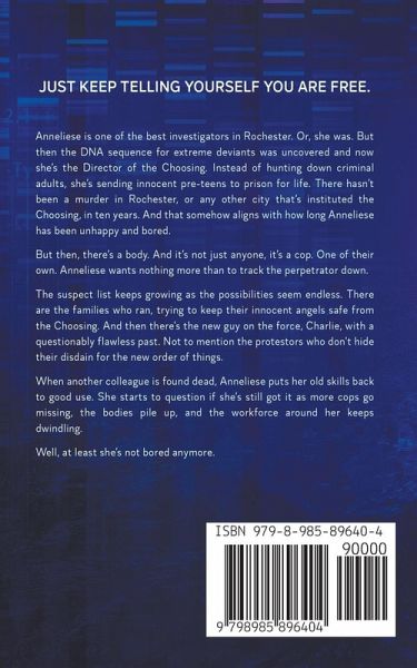 Just keep telling yourself you are free. Anneliese is one of the best investigators in Rochester. Or she was. Then the DNA sequence for serial killers was uncovered and now, instead of a detective, she's a director of the Choosing. Instead of hunting down criminals, she's sending pre-teens with the gene to prison for life. She hates her new job but can't argue that there hasn't been a murder in Rochester in twelve years. And she can't help but feel guilty about the fact that she's been bored and depressed without any murders to investigate. But then, there's a body. And it's not just anyone, it's a cop. Anneliese wants nothing more than to track the perpetrator down. She's suddenly back to what she loves doing—hunting down bad guys. But as the bodies start to pile up, the list of suspects expands and she's forced to dive into a new dark reality of society. Well, at least she's not bored anymore.