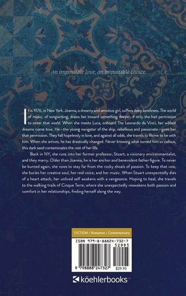 An impossible love. An impossible choice. It is 1976, in New York. Joanna, a dreamy and sensitive young woman, suffers deep loneliness and a sense of never belonging. The world of music, of songwriting, draws her toward something deeper, if only she had permission to enter that world. When she meets Luca, onboard The Leonardo da Vinci, her wildest dreams come true. He-the young navigator of the ship, rebellious and passionate-gives her that permission. They fall hopelessly in love, and against all odds, she travels to Rome to be with him. When she arrives, he has drastically changed. Never knowing what turned him so callous, this dark seed contaminates the rest of her life. Back in NY, she runs into her former professor, Stuart, a visionary environmentalist, and they marry. Older than Joanna, he is her anchor and benevolent father figure. To never be burned again, she vows to stay far from the rocky shoals of passion. To keep that vow, she buries her creative soul, her real voice, and her music. When Stuart unexpectedly dies of a heart attack, her unlived self awakens with a vengeance. Hoping to heal, she travels to the walking trails of Cinque Terre, where she unexpectedly reawakens both passion and comfort in her relationships, finding herself along the way.
