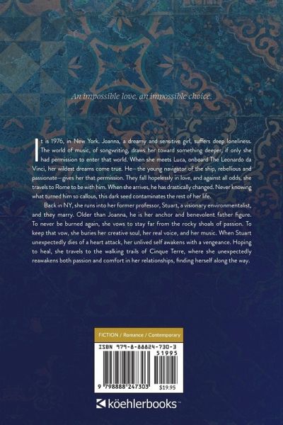 An impossible love. An impossible choice. It is 1976, in New York. Joanna, a dreamy and sensitive young woman, suffers deep loneliness and a sense of never belonging. The world of music, of songwriting, draws her toward something deeper, if only she had permission to enter that world. When she meets Luca, onboard The Leonardo da Vinci, her wildest dreams come true. He-the young navigator of the ship, rebellious and passionate-gives her that permission. They fall hopelessly in love, and against all odds, she travels to Rome to be with him. When she arrives, he has drastically changed. Never knowing what turned him so callous, this dark seed contaminates the rest of her life. Back in NY, she runs into her former professor, Stuart, a visionary environmentalist, and they marry. Older than Joanna, he is her anchor and benevolent father figure. To never be burned again, she vows to stay far from the rocky shoals of passion. To keep that vow, she buries her creative soul, her real voice, and her music. When Stuart unexpectedly dies of a heart attack, her unlived self awakens with a vengeance. Hoping to heal, she travels to the walking trails of Cinque Terre, where she unexpectedly reawakens both passion and comfort in her relationships, finding herself along the way.