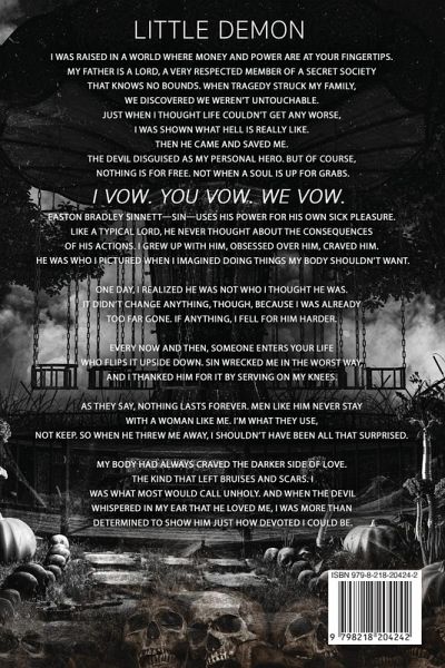 NOW AN AMAZON TOP 5 BESTSELLER An all-new dark standalone romance from the USA Today & Wall Street Journal bestselling author, Shantel Tessier LITTLE DEMON I was raised in a world where money and power are at your fingertips. My father is a LORD, a very respected member of a secret society that knows no bounds. When tragedy struck my family, we discovered we weren't untouchable. Just when I thought life couldn't get any worse, I was shown what hell is really like. Then he came and saved me. The devil disguised as my personal hero. But of course, nothing is for free. Not when a soul is up for grabs. I VOW. YOU VOW. WE VOW. Easton Bradley Sinnett-Sin-uses his power for his own sick pleasure. Like a typical Lord, he never thought about the consequences of his actions. I grew up with him, obsessed over him, craved him. He was who I pictured when I imagined doing things my body shouldn't want. One day, I realized he was not who I thought he was. It didn't change anything, though, because I was already too far gone. If anything, I fell for him harder. Every now and then, someone enters your life who flips it upside down. Sin wrecked me in the worst way, and I thanked him for it by serving on my knees. As they say, nothing lasts forever. Men like him never stay with a woman like me. I'm what they use, not keep. So when he threw me away, I shouldn't have been all that surprised. My body had always craved the darker side of love. The kind that left bruises and scars. I was what most would call unholy. And when the devil whispered in my ear that he loved me, I was more than determined to show him just how devoted I could be. ¿Things to know about The Sinner Stalker Secret society MF (no sharing the h) J/P (jealous/possessive) Hero OTT (over the top) Hero Complete standalone Told in dual POV TWs listed inside the book