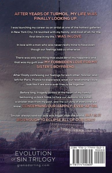 From Wall Street Journal Bestselling Author Giana Darling comes the angsty conclusion to The Evolution of Sin trilogy and the romance between billionaire Sinclair and his Italian artist, Giselle. Does everyone deserve a happily-ever-after? After years of turmoil, my life was finally looking up. I was launching my career as an artist at one of the hottest galleries in New York City, I'd reunited with my family, and most of all, for the first time in my life, I was in love. In love with a man who was never really mine to have even though our feelings told us otherwise. There was only one thing that could derail my happiness and that was my guilt over my forbidden love for my sister's boyfriend. After finally confessing our feelings for each other, Sinclair and I left for Paris to experience what our relationship could look like if we were ever free to be together. Before long, tragedy strikes at the heart of my family, beckoning us back home to face our demons: my sister, a sinister man from my past, and the scrutiny of everyone we know condemning our happily-ever-after. Sinclair always said our love was bigger than the world, but is it big enough to eclipse all of our sins? *Previously published as The Consequence. Must be read as book three in The Evolution of Sin Trilogy.*