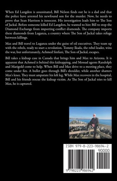 When Ed Langdon is assassinated, Bill Nelson finds out he is a dad and that the police have arrested his newfound son for the murder. Now, he needs to prove that Sean Harrison is innocent. His investigation leads him to The Son of Jackal. Before someone killed Ed Langdon, he wanted to hire Bill to stop the Diamond Exchange from importing conflict diamonds. The company imports these diamonds from Luganza, a country where The Son of Jackal takes refuge between killings. Max and Bill travel to Luganza under the guise of oil executives. They team up with the rebels, ready to start a revolution. Tommy Ikada, the rebel leader, wins the war, but unfortunately, Achmed Sinfani, The Son of Jackal, escapes. Bill takes a kidnap case in Canada that brings him and Max to Arizona. It is apparent that Achmed is behind this kidnapping, and Mossad agents Randolph and Marigold come to help. When Bill and Max drive to a meeting place, they come under fire. A bullet goes through Bill's shoulder, while another shatters Max's knee. They must amputate his left leg. While Max recovers in the hospital, Bill and his friends rescue the kidnap victim. As The Son of Jackal tries to kill Max, the Mossad agents capture him and fly him to Israel.