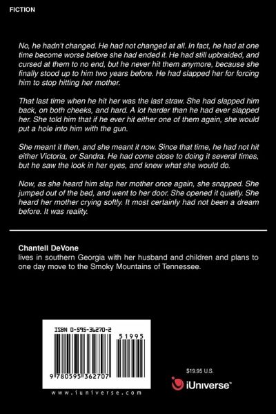 No, he hadn't changed. He had not changed at all. In fact, he had at one time become worse before she had ended it. He had still upbraided, and cursed at them to no end, but he never hit them anymore, because she finally stood up to him two years before. He had slapped her for forcing him to stop hitting her mother. That last time when he hit her was the last straw. She had slapped him back, on both cheeks, and hard. A lot harder than he had ever slapped her. She told him that if he ever hit either one of them again, she would put a hole into him with the gun. She meant it then, and she meant it now. Since that time, he had not hit either Victoria, or Sandra. He had come close to doing it several times, but he saw the look in her eyes, and knew what she would do. Now, as she heard him slap her mother once again, she snapped. She jumped out of the bed, and went to her door. She opened it quietly. She heard her mother crying softly. It most certainly had not been a dream before. It was reality.