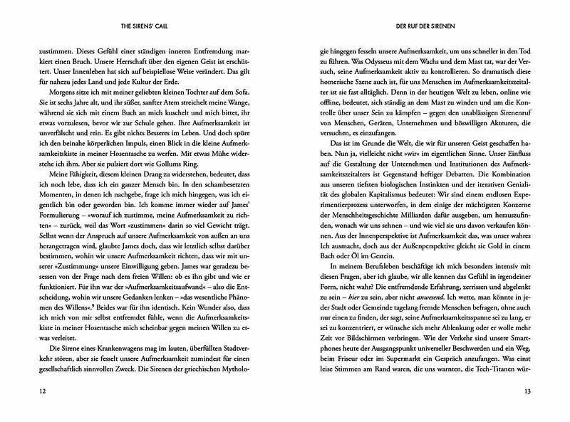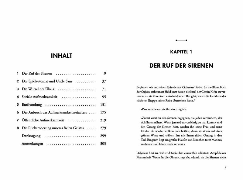 Aufmerksamkeit ist zu einer kommerziellen Ressource geworden. Einst waren die Sirenen mythische Wesen, die umherfahrende Seeleute in den Tod lockten. Heute ertönen sie rund um die Uhr in unseren Küchen und Schlafzimmern, beauftragt von den wertvollsten Unternehmen der Weltgeschichte, deren Ziel es ist, unsere gesamte Aufmerksamkeit auf sich zu bündeln. Das Ergebnis: Ständig starren wir auf unsere Handys und verlieren die Welt um uns herum aus den Augen.