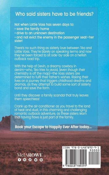 Who said sisters have to be friends? Not when Lottie Voss has seven days to:save the family home drive to an unknown destination and not evict the enemy in the passenger seat-her sister! ¿ There's no such thing as sisterly love between Téa and Lottie Voss. They're barely on speaking terms and now they've been forced to sit side-by-side on a hellish outback road trip. With the help of Devin, a dreamy cowboy in denim-who, Téa tries to avoid, (even though their chemistry is off the map)-the Voss sisters are determined to fulfil their father's wishes. Risking their lives on a journey that triggers childhood dreams and dramas, as they attempt to build some sort of sisterly bond and save the farm. Until they discover a family scandal that truly leaves them speechless! Crank up the air-conditioner as you travel to the land of heat and dust, in this charming and challenging romantic outback adventure, as these sisters learn that having flaws is just part of the family. Are you ready to Escape to a HAPPILY EVER AFTER?