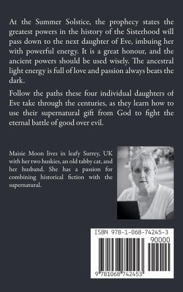 At the Summer Solstice, the prophecy states the greatest powers in the history of the Sisterhood will pass down to the next daughter of Eve, imbuing her with an ancient and powerful energy. She must be made to understand her purpose by the previous daughter of Eve. It is a great honour, and the ancient powers should be used wisely. The ancestral light energy is full of love and passion, remembering, the light will always beat the dark. Made up of four short stories, follow the path these four individual daughters of Eve take through the centuries, as they learn how to use their supernatural gift from God to fight the eternal battle of good over evil starting in medieval times, and ending in World War II.