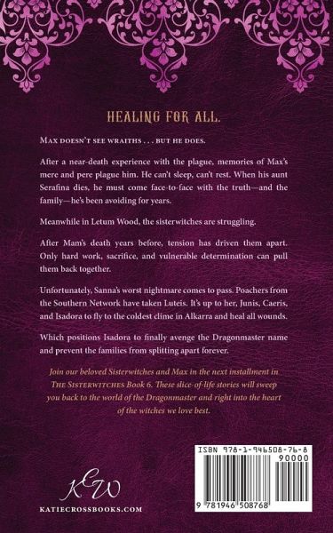 Healing For All Max doesn't see wraiths . . . but he does. After a near-death experience with the plague, memories of Max's mere and pere haunt him. He can't sleep, can't rest. When his aunt Serafina dies, he must come face-to-face with the truth-and the family-he's been avoiding for years. Meanwhile in Letum Wood, the sisterwitches are struggling. After Mam's death years before, tension has driven them apart. Only hard work, sacrifice, and vulnerable determination can pull them back together. Unfortunately, Sanna's worst nightmare comes to pass. Poachers from the Southern Network have taken Luteis. It's up to her, Junis, Caeris, and Isadora to fly to the coldest clime in Alkarra to heal all wounds. Which positions Isadora to finally avenge the Dragonmaster name and prevent the families from splitting apart forever, something she's secretly longed for for years. Join our beloved Sisterwitches and Max in the next installment in THE SISTERWITCHES: Book 6. These slice-of-life stories will sweep you back to the world of the Dragonmaster and right into the heart of the witches we love best.