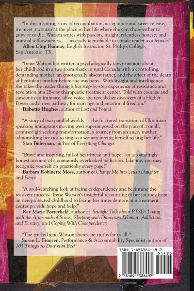 "Irene Watson has written a psychologically savvy memoir about her childhood in a two room shack in rural Canada with a controlling, demand-ing mother, an emotionally absent father, and the affect of the death of her infant brother before she was born. With insight and intelligence she takes the reader through her step by step experience of resistance and revelation at a 28-day therapeutic treatment center. Told with courage and candor in an intimate, alive voice she reveals her discovery of a Higher Power and a new pathway toward her marriage and emotional freedom." Babette Hughes, author of "Lost and Found