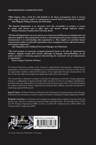 The Situated Organization explores recent research in organizational communication, emphasizing the organization as constructed in and emerging out of communication practices. Working from the tradition of the Montreal School in its approach, it focuses not only on how an organization's members understand the purposes of the organization through communication, but also on how they realize and recognize the organization itself as they work within it. "A useful resource for those engaged in quantitative methods analysis in conjunction with organizations or organizational communication." CHOICE