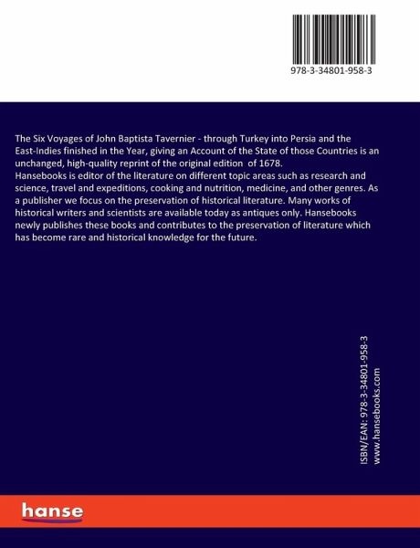 The Six Voyages of John Baptista Tavernier - through Turkey into Persia and the East-Indies finished in the Year, giving an Account of the State of those Countries is an unchanged, high-quality reprint of the original edition of 1678.Hansebooks is editor of the literature on different topic areas such as research and science, travel and expeditions, cooking and nutrition, medicine, and other genres. As a publisher we focus on the preservation of historical literature. Many works of historical writers and scientists are available today as antiques only. Hansebooks newly publishes these books and contributes to the preservation of literature which has become rare and historical knowledge for the future.